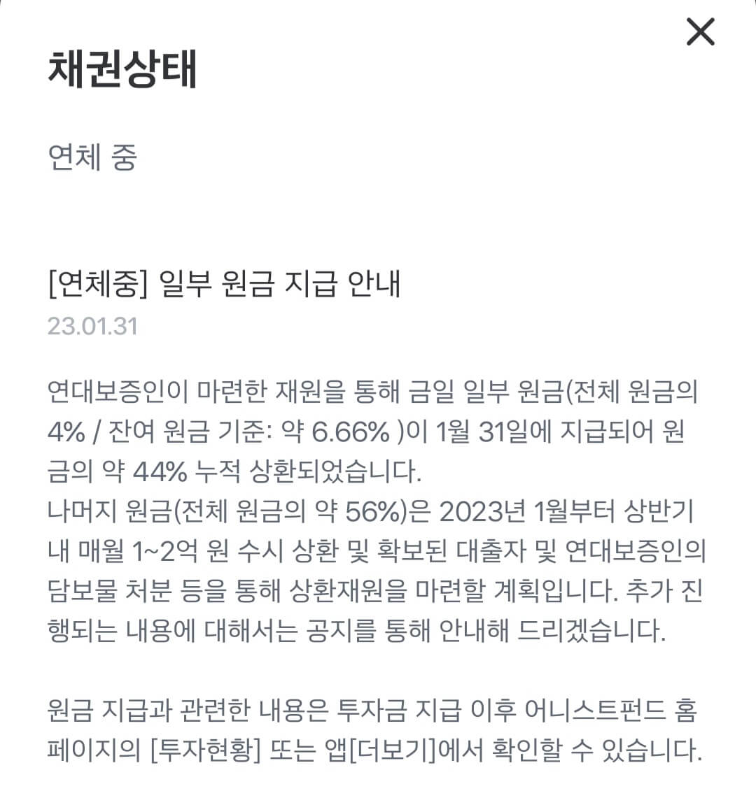 무려 어니스트 등급이 A1입니다. 정말 안전한 투자상품이라고 생각하고 거액을 투자했는데 결국 연체가 되었습니다. 12개월 동안 거의 매달 조금씩 이자 지급이 늦어 연체 이자를 받았었는데, 그때부터 상황이 좋지 않다는 것을 인식했어야 하나봅니다. 물론 그렇다고 해도 제가 어떻게 할 수 있는 방법은 없지만요.